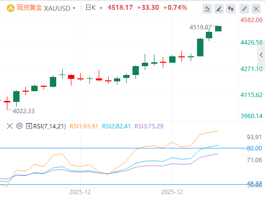周三亚盘,黄金徘徊在4518.17附近。受地缘政治紧张局势和美联储降息预期影响,黄金周二再度暴涨,刷新纪录高位。尽管最新GDP数据显示美国经济增长强劲,但市场情绪仍受明年美联储降息预期主导,未能提振美元。