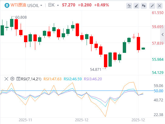 周一亚盘,原油交投57.27附近。在即将到来的假期缩短周,看空的供应侧交易者将关注延迟的EIA周储能报告,因为没有其他重大事件安排。看涨交易员将关注头条新闻,希望对包括美国查封委内瑞拉原油和乌克兰对俄罗斯基础设施加剧打击在内的地缘政治压力作出反应——这两者都可能带来短期供应流动的不确定性。