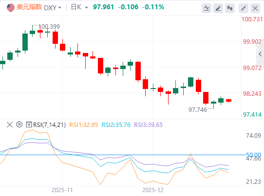 12月29日,北京时间周一亚市早盘,美元指数徘徊在97.96附近。上周五,美元指数在98关口附近震荡,最终收涨0.113%,报98.07;美债收益率涨跌互现,基准的10年期美债收益率最终收报4.137%,对美联储政策利率敏感的2年期美债收益率失守3.5%关口,收报3.481%。贵金属集体暴走。现货黄金一度接近4550美元/盎司,再创历史新高,最终收涨1.17%,报4531.96美元/盎司;现货白银涨势更加凶猛,美盘时段一路高歌,最终收涨10.06%,报79.04美元/盎司,同样刷新历史高位。现货铂金上涨8.75%至2435.60美元/盎司,创历史新高。随着投资者密切关注俄乌和谈前景,叠加即将到来的全球供应过剩,原油走势低迷。WTI原油盘中跳水,最终收跌2.53%,报56.99美元/桶,抹去周内大部分涨幅;布伦特原油最终收跌2.26%,报60.89美元/桶。