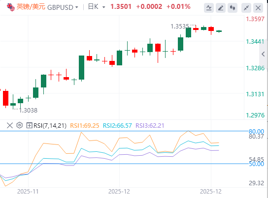 欧元:截至发稿,欧元/美元徘徊在1.1778附近。美国美联储(Fed)2026年降息的前景对美元兑欧元(EUR)造成压力。市场正准备美国总统唐纳德·特朗普提名一位美联储主席接替任期至五月结束的鲍威尔。周一晚些时候,美国11月待售房屋报告将发布。技术面上,欧元/美元保持了积极势头。20日均线突破100日和200日均线,较长的指标也略微上行,使买方保持控制。