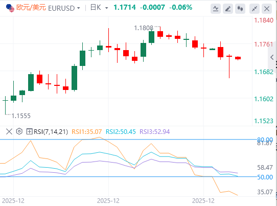 美元指数:截至发稿,美元徘徊在98.38附近。美元兑主要货币在12月下跌,但在圣诞节前后真正触底,在周五就业数据公布之前,美元将出现上行修正,本周及下周的通胀、工业生产和零售销售等数据,或将强化美国经济未进一步恶化、美联储在第一季度将按兵不动的观点。技术面上,眼下正测试98.74一线阻力——该位置同时也是前期的关键支撑位。上方来看,99.00关口的200期指数平均线(200-SMA)是重要阻力位;下方支撑则位于98.12和97.90。当前相对强弱指标(RSI)读数为69,释放出积极的动能信号。