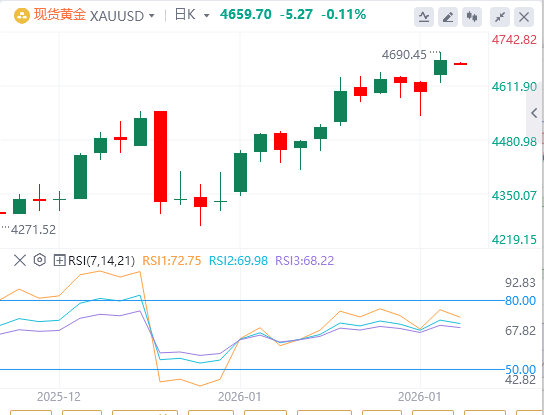 周二亚盘,黄金徘徊在4659.70附近。随着交易员涌向避险资产,这一黄金将创下新的历史新高,且地缘政治和经济前景持续严峻。美国总统唐纳德·特朗普周六表示,他将对拒绝其收购格陵兰计划的八个欧洲国家的商品征收新关税。受影响的国家包括丹麦、挪威、瑞典、法国、德国、荷兰、芬兰和英国(UK)。