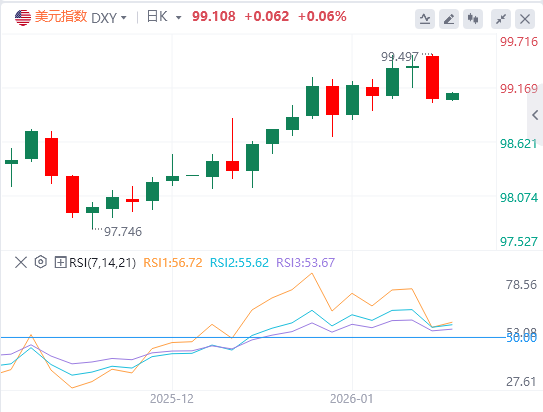 1月20日,北京时间周二亚市早盘,美元指数徘徊在99.10附近。周一,特朗普威胁对欧洲加征关税,令投资者转向瑞郎等避险货币,美元指数日内承压,最终收跌0.33%,报99.05;基准的10年期美债收益率最终收报4.227%,对美联储政策利率敏感的2年期美债收益率收报3.592%。受助于避险需求,现货金银周一双双创下纪录新高,现货黄金一度触及4690美元,最终收涨1.64%,报4670.76美元/盎司;现货白银最终收涨4.69%,报94.30美元/盎司。美伊局势缓和,国际油价持稳,格陵兰岛局势成关注焦点。WTI原油最终收涨0.32%,报59.42美元/桶;布伦特原油最终收涨0.12%,报63.24美元/桶。