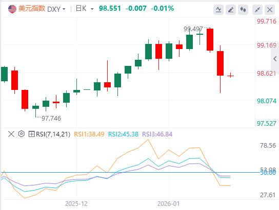 1月21日,北京时间周三亚市早盘,美元指数徘徊在98.54附近。周二,白宫就格陵兰岛的未来向欧洲发出威胁,再度引发“抛售美国”交易,美元指数最终收跌0.49%,报98.56;基准的10年期美债收益率最终收报4.3000%,对美联储政策利率敏感的2年期美债收益率收报3.6050%。特朗普威胁要对欧洲盟友征收额外关税,引发对避险资产的抢购,现货黄金首次突破4760美元,最终收涨1.82%,报4763.25美元/盎司;现货白银刷新新高至95.86美元,最终收涨0.25%,报94.60美元/盎司。因哈萨克斯坦油田暂时停产,以及全球经济增长更加强劲的预期可能推动燃料需求,WTI原油最终收涨0.17%,报59.5美元/桶;布伦特原油低开高走,最终收跌0.13%,报63.55美元/桶。