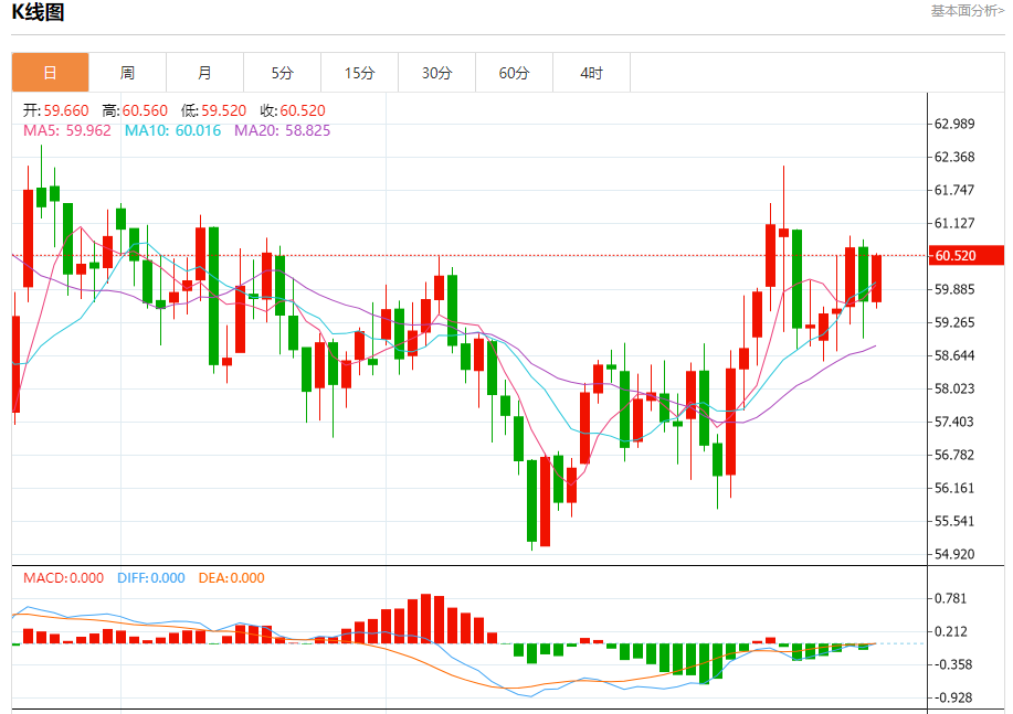原油市场:截止北京时间21:20,美油上涨,现报60.510,涨幅1.94%。纽市盘前,(原油)价格在最近一个交易日扩大了涨幅,受到相对强弱指标出现积极信号的支持,超过了EMA50的阻力,摆脱了其负面压力,准备到达60.50美元的关键阻力,在短期主要看涨趋势占主导地位的情况下,其交易沿着该趋势的支撑趋势线进行。