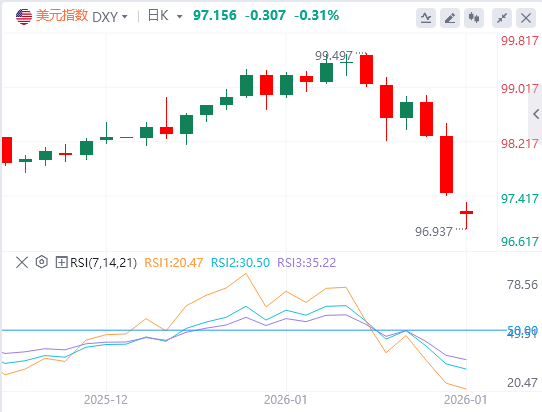 1月26日,北京时间周一亚市早盘,美元指数徘徊在97.15附近。上周五,因地缘政治紧张局势令投资者不安,美元指数全日下行,最终收跌0.84%,报97.46,创去年6月以来的最大周线跌幅;基准的10年期美债收益率最终收报4.233%,对美联储政策利率敏感的2年期美债收益率收报3.607%。现货黄金再创新高,距离5000美元仅一步之遥,最终收涨1.04%,报4986.13美元/盎司;现货白银冲上100美元/盎司,最终大涨7.34%,报100.23美元/盎司。周一开盘,现货黄金冲上5020美元大关,白银一度冲上106美元。因美国总统特朗普对运输伊朗石油的船只实施更多制裁并宣布一支舰队正前往中东,国际油价有所回升。WTI原油最终收涨2.81%,报61.39美元/桶;布伦特原油最终收涨2.72%,报66.08美元/桶。