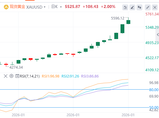 技术面:黄金价格涨势延续,已经连续六个交易日创下历史新高,呈抛物线式上涨。黄金买家接下来可能瞄准5500美元/盎司。反之,若金价重挫至5300美元/盎司下方,则首个支撑位在5250美元/盎司,其次是5200美元/盎司。