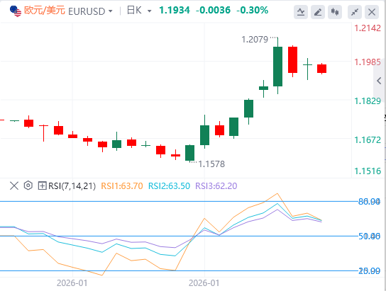 技术面:黄金价格仍偏上上涨,但如果未能收盘于1月28日日单线高点5415美元,似乎将开始盘整。看涨势头已减弱,相对强弱指数(RSI)显示。RSI从极端超买区间回落,但当其目标接近70阈值时,表明买卖双方都不再掌控局面。如果黄金保持在5300美元以上,可能会在5300至5400美元区间横盘交易。若突破区间上限,将暴露5500美元及最高价5598美元。相反,如果黄金跌破5300美元,可能会加剧跌向5200美元及以下的趋势。