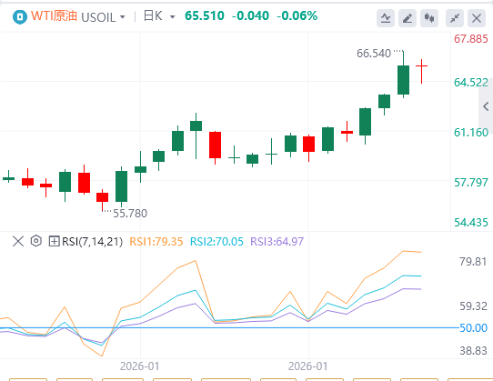 技术面:从日线结构看,价格已站稳61.00美元这一关键支撑位,目前正逼近65.09美元的前高区域。MACD指标显示DIFF为1.23,DEA为0.72,MACD柱扩大至1.03,均处于零轴上方且动能仍在增强,说明多头仍占主导。但RSI已达67.78,接近70的超买区间,提示短期上涨动能过快,后续可能出现横盘整理或小幅回调来消化压力。