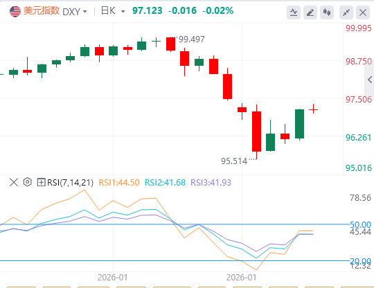 美元指数:截至发稿,美元徘徊在97.12附近。随着交易员对12月生产者价格报告的反应,美元指数持续反弹。PPI环比上涨+0.5%,而分析师预测为+0.2%。核心PPI增长+0.7%,分析师预计将上涨+0.2%。交易员们也对特朗普提名凯文·沃什为下一任美联储主席的决定作出反应。技术面上,如果美元指数保持在96.35–96.50阻力位之上,将向下一个阻力位移动,该阻力位于97.10–97.25区间。