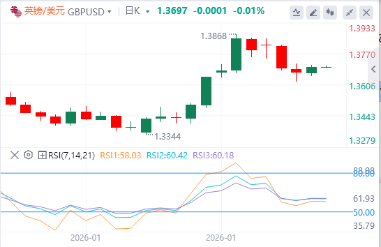 英镑:截至发稿,英镑/美元徘徊在1.3697附近。周二,英镑在美元面前窄幅波动,略微上涨至接近1.3700,因市场在英国央行(BoE)2026年首次政策决定前采取谨慎立场。技术面上,如果这次尝试成功,英镑/美元将朝下一个阻力位移动,该阻力位于1.3815至1.3830区间的近期高点附近。