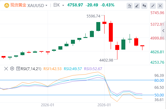 周五亚盘,黄金徘徊在4758.97附近。贵金属继续加剧下跌,交易者弥补股票亏损并调整头寸。密歇根州二月份消费者信心指数报告的初步读数将于周五晚些时候公布。芝加哥商品交易所(CME),全球领先的衍生品市场,再次提高了黄金和白银期货合约的初始保证金要求,增加了交易者开仓和持有持仓所需提交的抵押品数量。此外,科技股下跌迫使一些交易者清仓黄金以满足保证金要求,对黄金金属施加了一定的抛售压力。