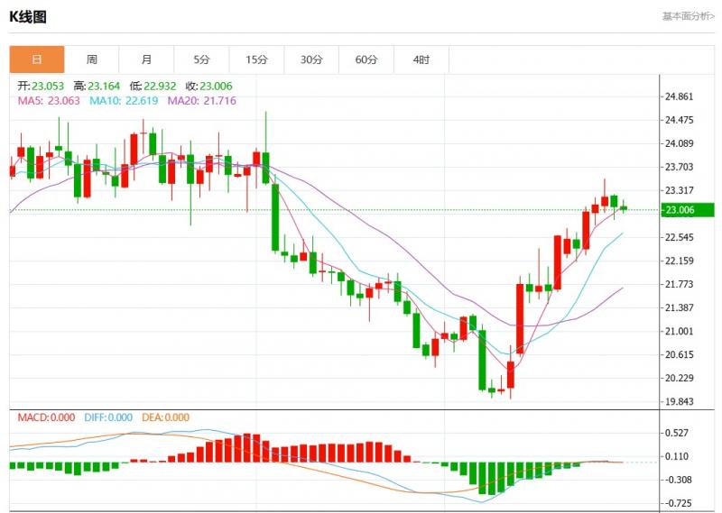 周二欧市盘中,现货白银报22.998,跌幅0.21%。