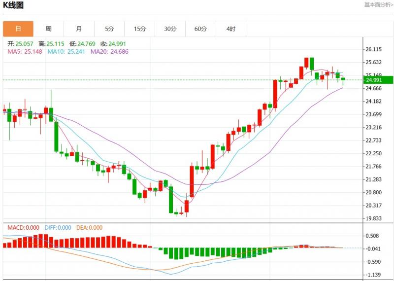 周一欧市盘中,现货白银报24.996,跌幅0.21%。