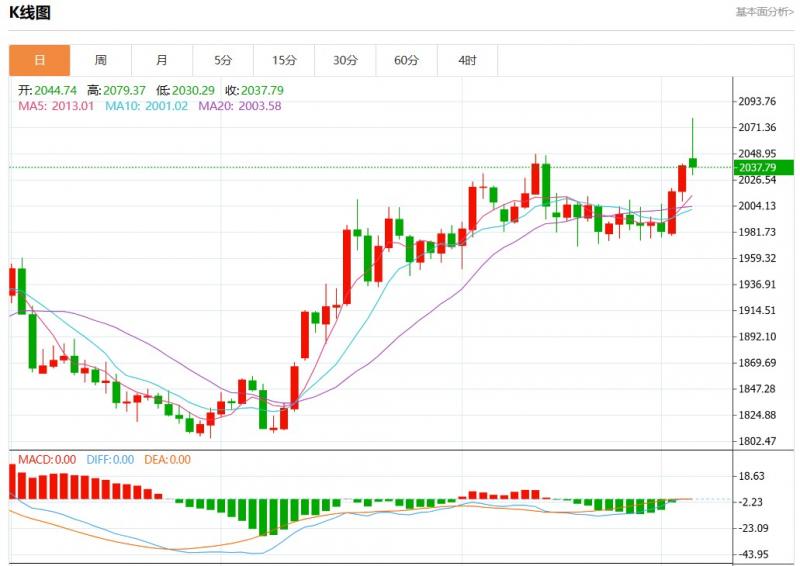 周四欧市盘中,现货黄金报2037.38,跌幅0.32%。