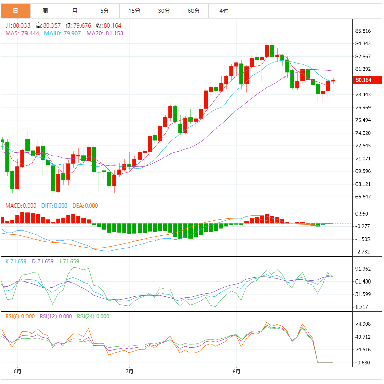 美原油窄幅震荡,目前交投于80.08美元/桶附近,虽然对全球经济前景的担忧仍令多头有所顾忌,但美国连续第九个月削减了活跃钻机数,而且沙特有可能延长减产计划至10月份,投资者预计今年剩余时间原油市场可能会保持短缺状态,这给油价提供支撑;而且美国燃油期货升至7个月高位,也给原油多头提供信心。
