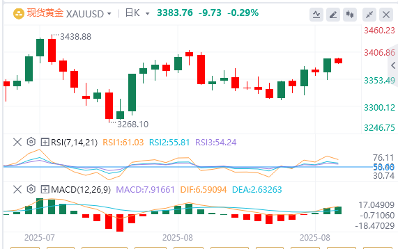 金价升至逾两周最高,受避险需求提振,特朗普解雇美联储理事后,投资者对联储的信心有所动摇。现货金上涨0.8%,收报每盎司3392.33美元附近。