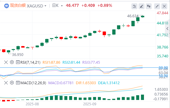 银价自36.20一线开始震荡上行,隔夜再创出近来新高,达到46.64一线,涨幅进一步扩大到10.44美元,交易重心继续上行,表明当前白银走势为偏多。均线系统上,价格高于60均线及100均线,且均线保持上行,表明白银处于上涨之势。操作上,顺当前走势,坚持逢低做多的操作思路,关注支撑位45.70一线,如若在此震荡企稳,可考虑布局多单,上行关注46.64一线,若上破,则多头进一步测试47.00整数关口的压力位。