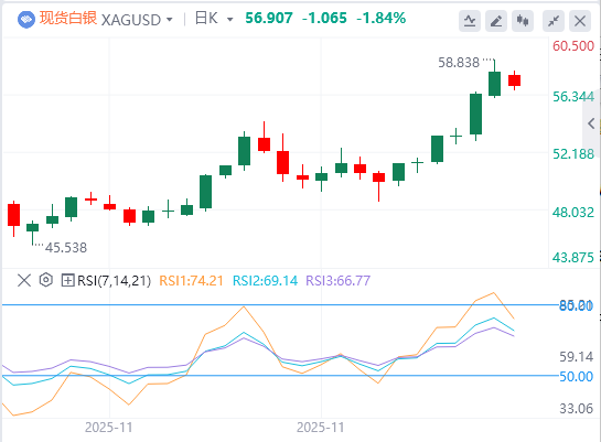 白银延续创新高节奏,上个交易日最高达到58.75一线,涨幅进一步扩大,整体的交易重心继续上行。均线系统上,60均线高于100均线,且双均线维持拐头向上,维持看涨的多头排列之势,表明白银当下仍然处于强势多头中。操作上,依托下方的支撑,尝试逢低做多的操作思路,关注支撑位56.32一线,如若在此震荡企稳,可考虑布局多单,上行关注57.75一线的压力,若上破,则多头进一步测试前高58.75附近的压力。