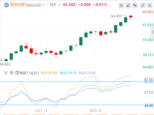 从波浪来看,白银当前处于自下方56.40一线开启上行的3浪过程之中,可尝试跟进。整体来看,白银呈现阶梯式强势单边上行节奏,高低点不断抬高。从下方MACD指标来看,量能处于零轴之上,并表现出多头量能的堆积。操作上建议逢低布局多单思路为主。