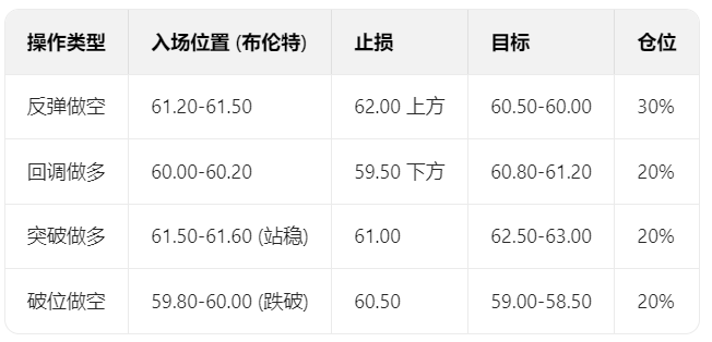 小时级别:支撑位60.50(日内回调低点)、60.00(整数关口);阻力位61.00-61.20(日内高点区域)、61.50(强压力)。