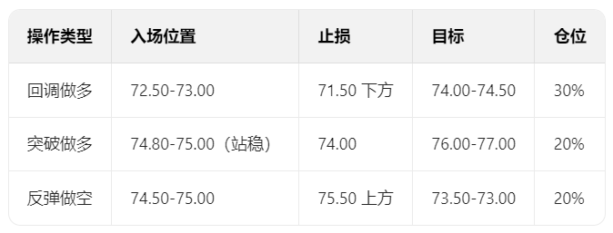 小时级别:支撑位73.00(日内回调低点)、72.00(20周期均线);阻力位74.50-75.00(日内高点区域)、76.00(强压力)。