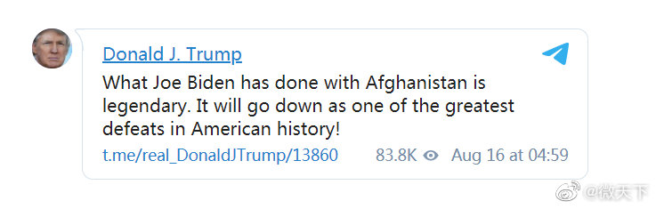 【#特朗普就阿富汗局势炮轰拜登#:美国历史上最大的失败之一】据俄罗斯卫星网报道,美国前总统特朗普15日就阿富汗局势发表声明,称塔利班对阿富汗的迅速占领是“美国历史上最大的失败之一”。特朗普在写道:“乔·拜登在阿富汗所做的一切都是传奇,这将成为美国历史上最伟大的失败之一!”