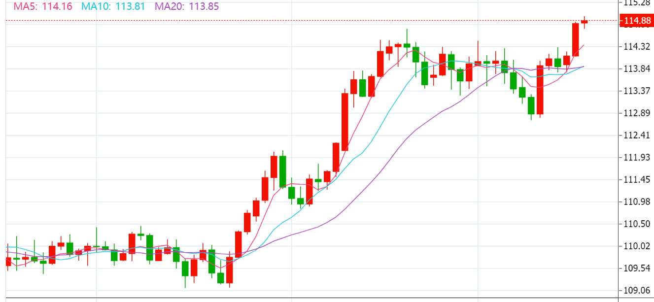 技术上,日图突破前高114.25阻力,并刷新新高,维持在114.70上方有望扩大进一步涨幅。4小时图短期均线向上发散提供支持,当前多头占主导。小时图震荡走高,短线回调关注114.50支持。