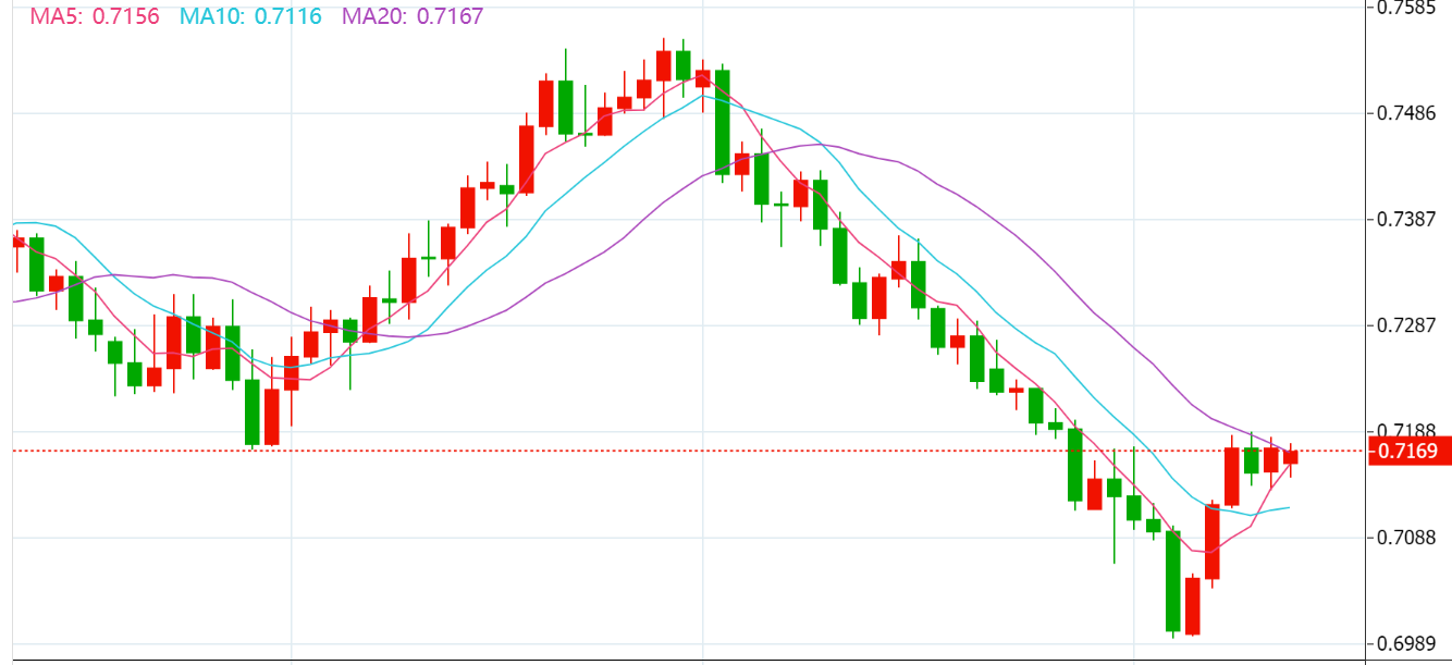 周图显示,澳元/美元继测试200均线后遇到卖盘,相对强弱指标几乎未自超卖指标反弹,目前该指标处在41附近。另一方面,若澳元/美元跌破 0.7125,则将重测年线低点。