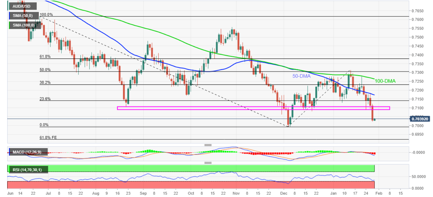 技术日图显示,相对强弱指标超卖,验证汇价测试0.7000 心理关口。然而,在MACD 信号看跌的情况下,若汇价明确跌破5 个月水平阻力位 0.7090 和0.7110 区间,则空头将维持期待。