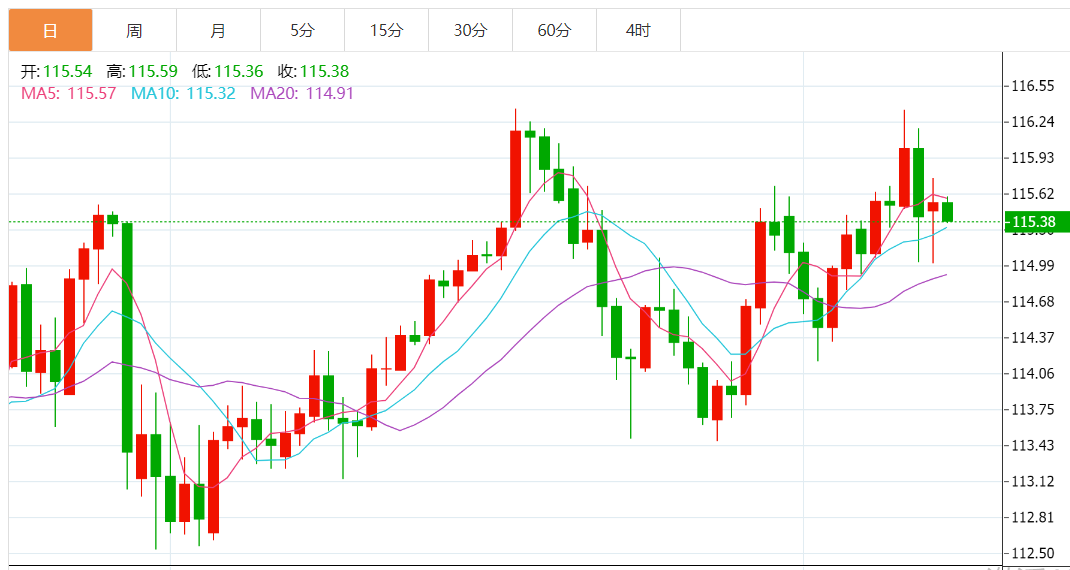 技术上,日图整体上行势头维持完好,短线在前高116.35受阻回落,暂时在115.00上方拉锯。4小时图在115.00一线护盘明显,短线阻力关注115.75。小时图仍企稳MA200,暂时看震荡。