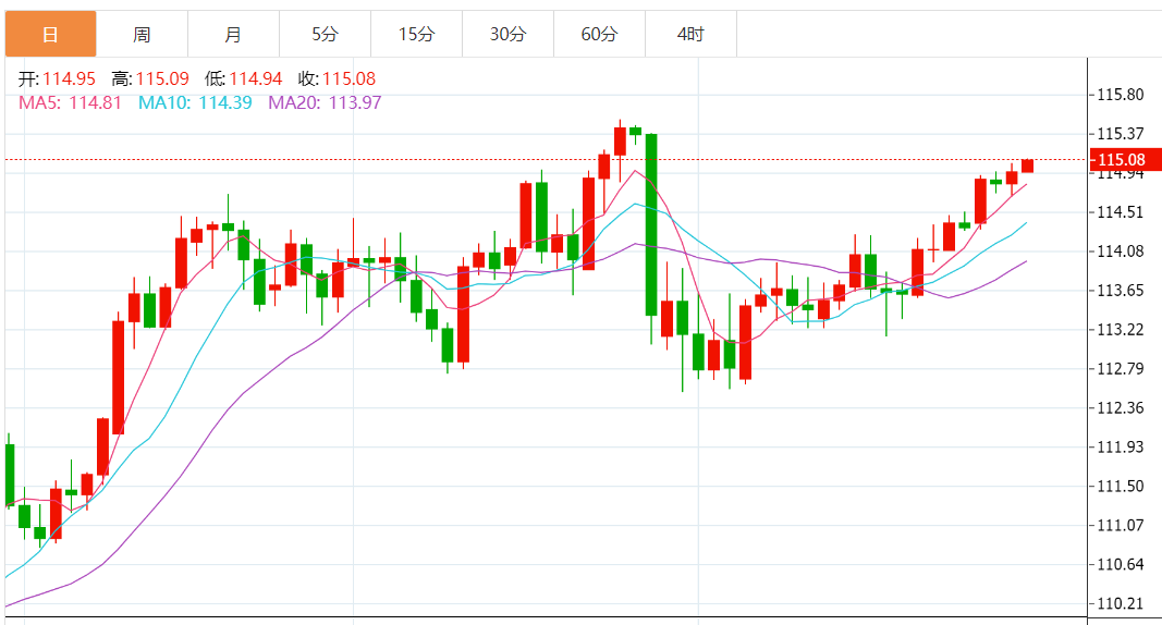 周四(12月30日)美元兑日元延续近期涨势,重回115水平上方。此前,美国10年期国债收益率在周三上涨近5%,推动了该货币对的上行。 基本面分析 多种支撑因素的组合帮助美元兑日元延续了本月初以来的上行趋势,并在周四上半段交易中获得牵引力。金融市场的风险情绪继续打压避险日元,并推动美元兑日元对走强。 奥密
