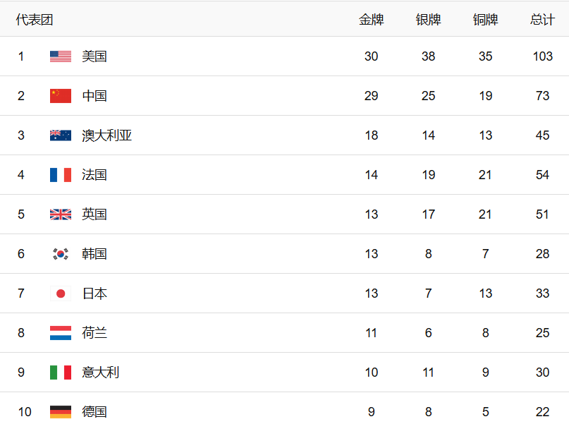 巴黎奥运会奖牌榜