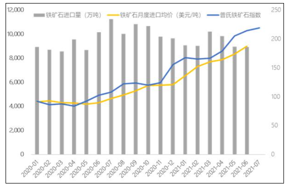 据海关总署7月13日消息,2021年上半年,我国铁矿石进口量同比增长2.6%,至5.61亿吨。有媒体统计称,这是自2020年5月以来,我国进口铁矿石的月度最低纪录。从去年底开始,铁矿石价格一路高歌猛进,在5月中旬普氏铁矿石指数创下了223.8新的历史高点,而后维持在210一线区间震荡(详见图1),那么下半年国内大范围实际压减钢铁产量的措施将进入实施阶段,对铁矿石的价格能否形成明显的打压态势,小编将从以下两个方面进行分析。