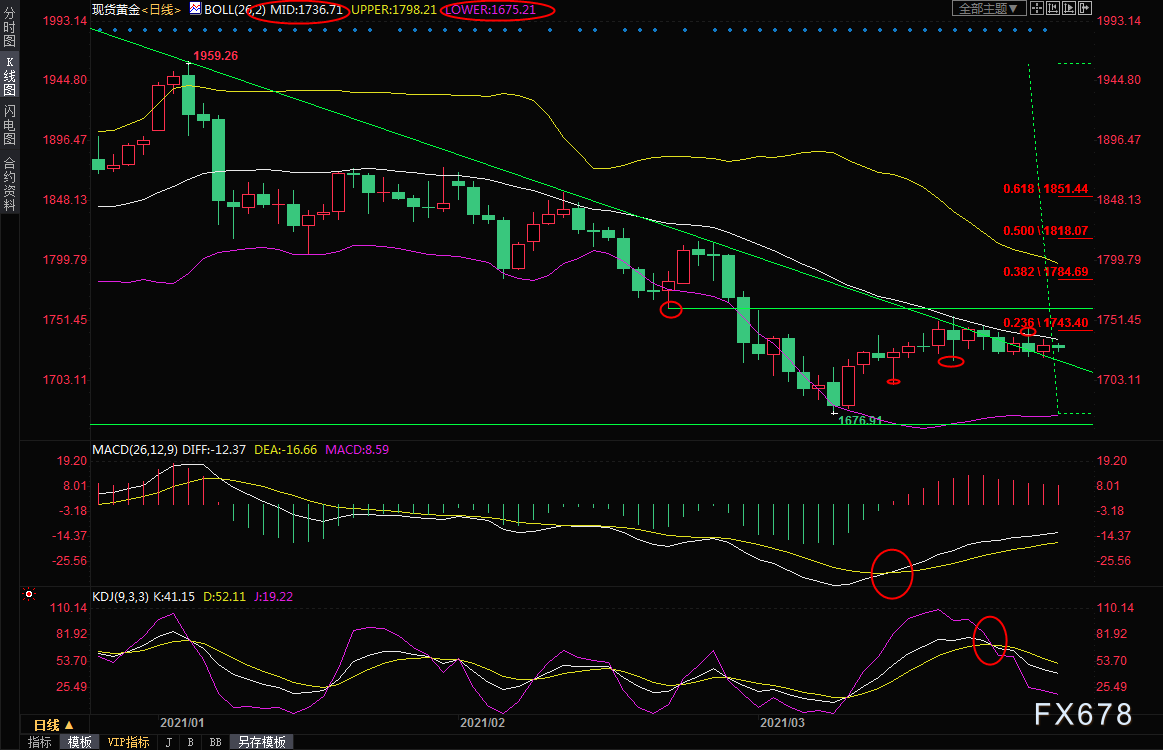 日线级别:震荡下跌;MACD金叉,KDJ死叉,均线交织,近几个交易日波动较小,意味着短线走势变数较大,由于布林线中轨等多重阻力仍对金价压制明显,顶破布林线中轨前,后市走势略微偏向空头。