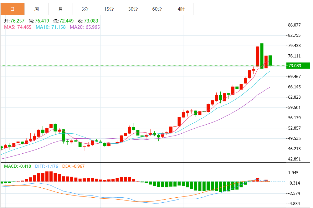 技术指标显示,移动平均趋同/背离(MACD)线仍低于信号线并在零标记下方,而相对强弱指数(RSI)已回到50线以上的看涨区域。日线图中的看跌吞没形态是一个负面信号,可能预示着更深的修正。 阻力位在76.50美元的日内水平,之后是80.00美元的心理关口和历史高点85.87美元。