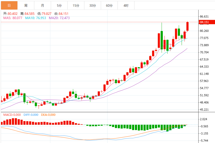 周一(1月12日),现货白银目前位于84.173美元/盎司附近,涨幅为5.34%。