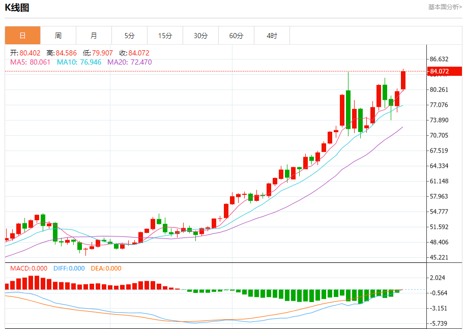 周一盘中,现货白银报84.080,涨幅5.18%。