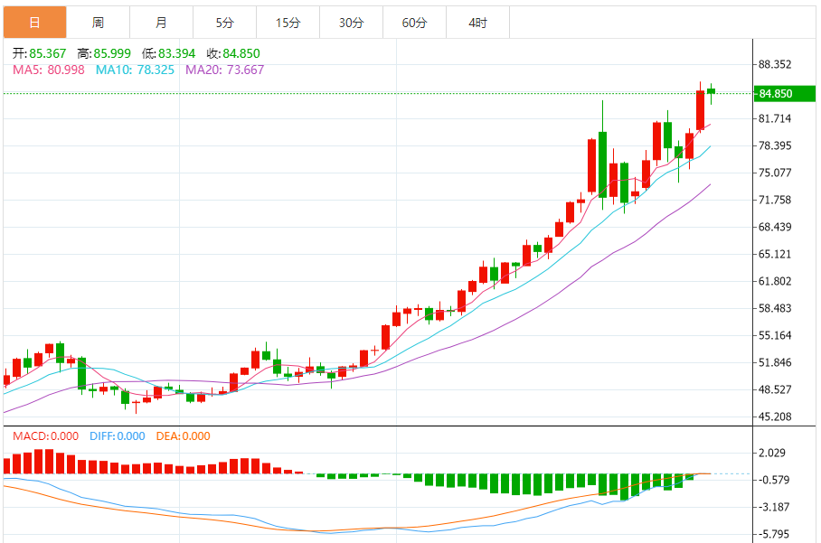 周二(1月13日),现货白银目前位于84.785美元/盎司附近,跌幅为0.35%。