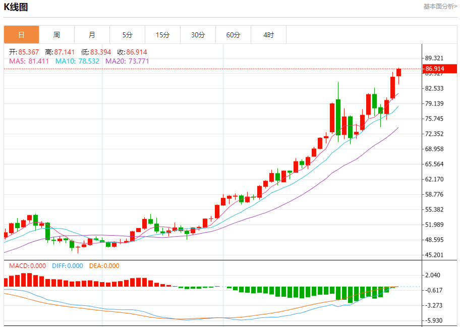 周二盘中,现货白银报87.290,涨幅2.61%。