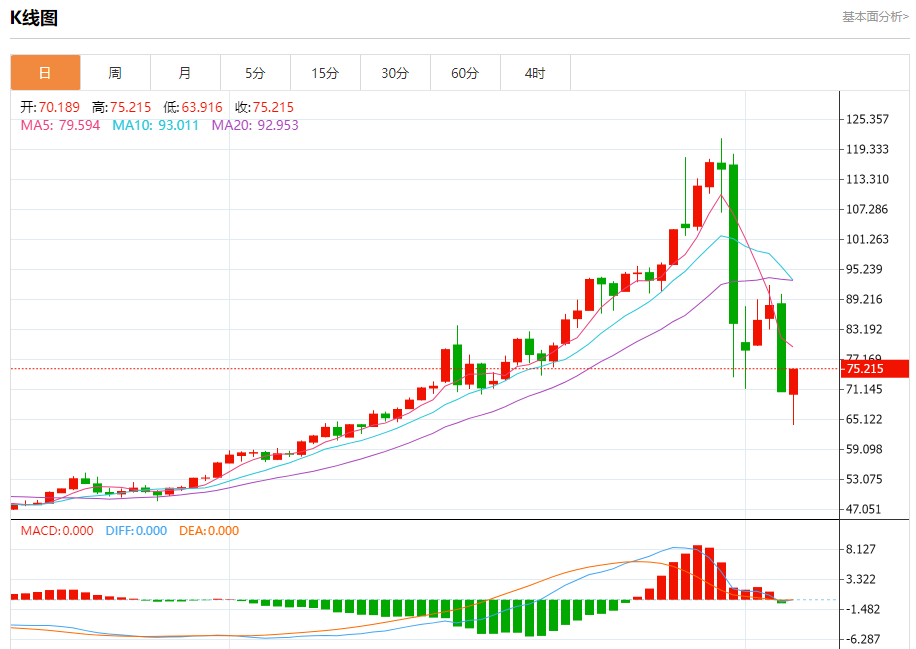 周五盘中,现货白银报75.155,涨幅6.29%。