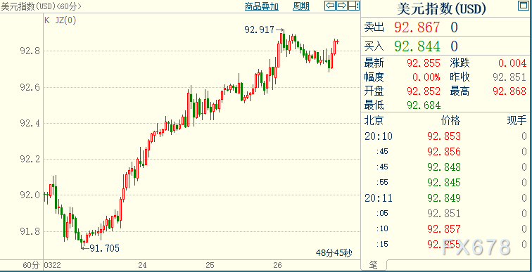 美指日内一度下挫逾0.2%至92.684。美指上日录得近四个月高位92.917,本周累计大涨近1%,盘中技术上存在调整需求。
