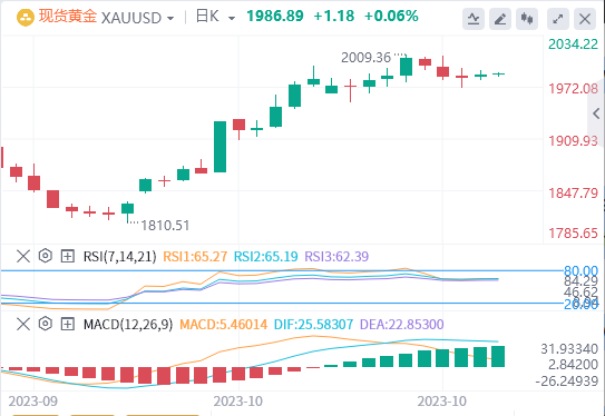 金价目前处于不稳定状态,投资者因预期即将发布的美国10月非农就业报告而持有头寸。现货黄金相对稳定在每盎司1986.49美元,期货价格同样稳定在1994.10美元。