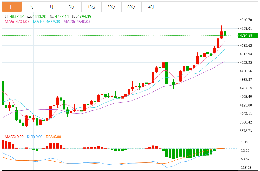 日线级别:延续三连阳走势,均线系统维持5/10/20日均线多头排列,5日均线支撑位于4725-4730美元区间,为中期趋势提供依托。K线收出带长上影线的阳线,反映4800美元上方抛压显著,且昨日高点4888美元形成短期强压制,首次冲高后难以快速站稳,需震荡消化获利盘。量能层面,冲高过程中成交量未同步放大,说明追高资金意愿不足,高位资金出逃迹象初显。