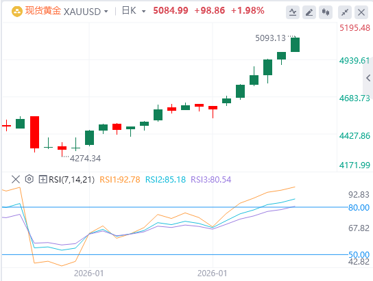 周一亚市盘中,现货黄金再创新高,距离5100美元仅一步之遥,截至目前,黄金报价5084.99。