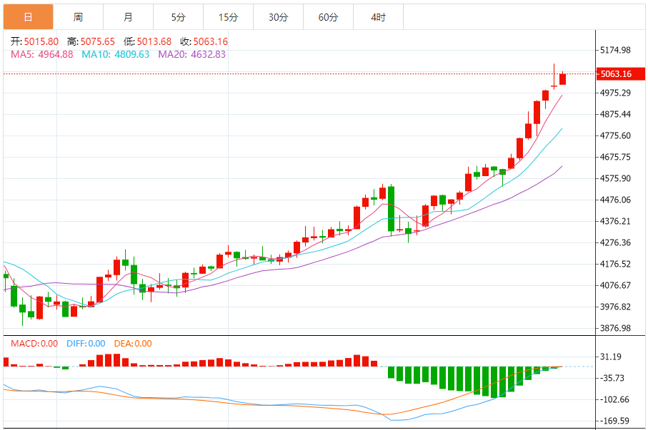 日线图显示,黄金已形成六连阳上涨态势,均线系统维持完美多头排列,5日均线支撑于4950-4960美元区间,为短期趋势提供坚实防守。指标方面,MACD快慢线维持金叉形态,DIFF=168.81、DEA=123.98,零轴上方柱状体虽仍处高位,但较前一交易日略有收敛,暗示多头动能边际放缓。RSI(14)指标读数高达85.28,进入严重超买区域,且日线收出倒锤形小阳线,反映高位多空分歧加剧,回调压力逐步累积。