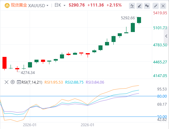 从4696.64美元起的上升通道支撑上升趋势,阻力位接近5,274.38美元。移动平均收敛背离线(MACD)线位于信号线之上,两者均高于零,反映多头动能增强。直方图开始收缩,暗示动能可能冷却至阻力位。RSI位于77(超买)警告,上方可能在通道顶部附近受限。