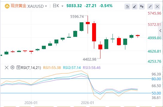 与此同时,从4397.52美元上涨的趋势线支撑了看涨倾向,支撑位在4819.19美元附近。如果黄金价格守住上升支撑,多头可能延续反弹,而收盘若收于其下方,将挑战上升趋势,为更深回调至4,397.52美元打开空间。