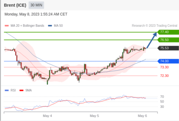 交易策略: 在 74.00 之上,看涨,目标价位为 76.50 ,然后为 77.40 。