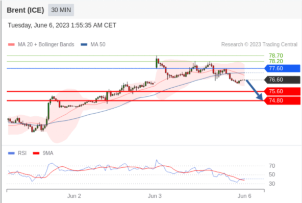 交易策略: 在 77.60 之下,看跌,目标价位为 75.60 ,然后为 74.80 。